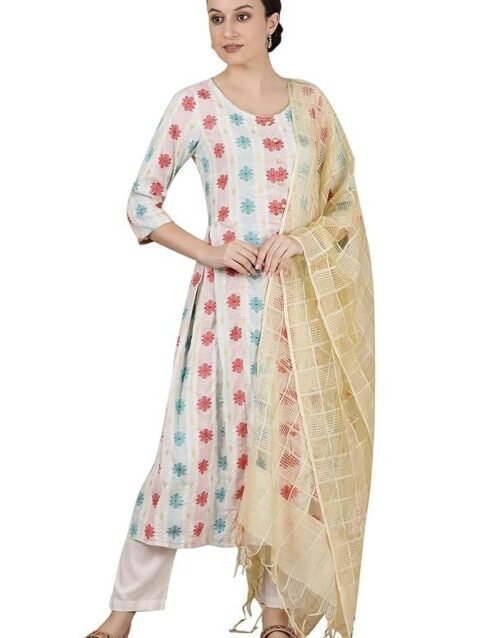 Aurelia Women White Floral Print Viscose Kurta Set with Trousers & Dupatta