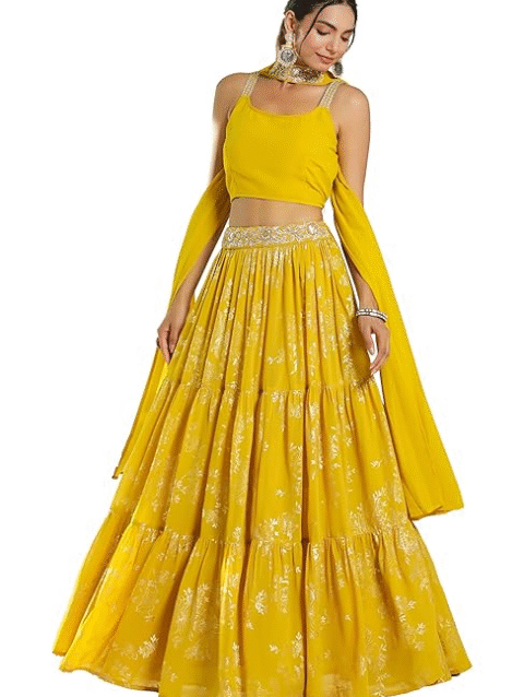 Janasya Womens Georgette Readymade Embellished Foil Printed Tiered Ready To Wear Lehenga Choli Set