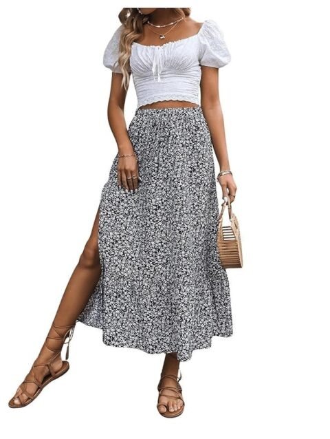 Rocks Women’s Casual High Waist Floral Print Skirt Split Thigh A Line Maxi Skirts