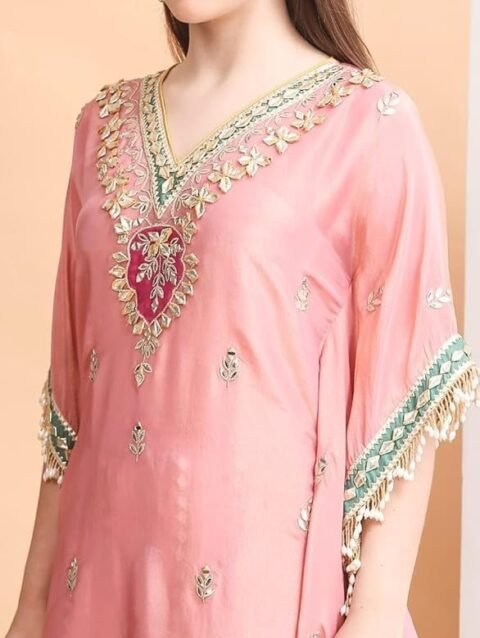 Traditional Embroidered Kaftan Palazzo Set, Pink, V-Neck with Fringe Details, Floral Embellished