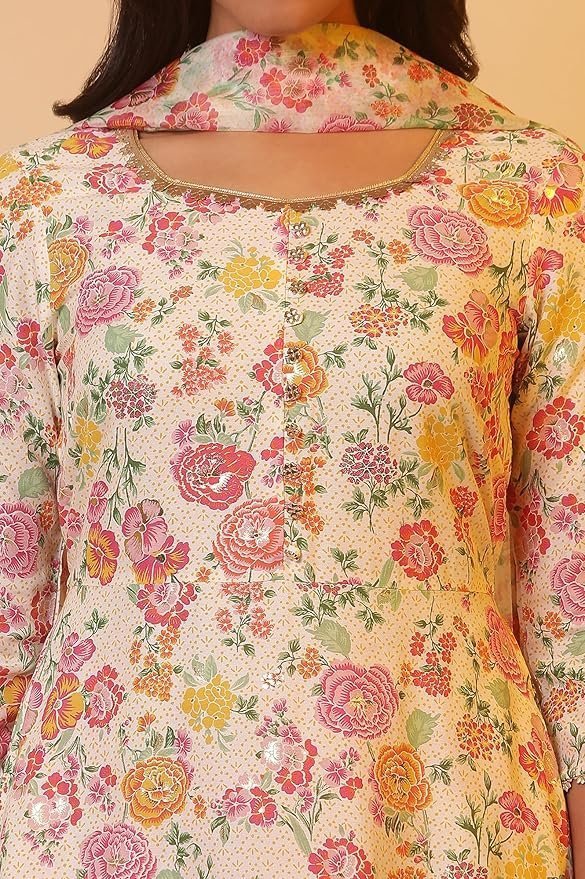 Aurelia Women White Floral Print Viscose Kurta Set with Trousers & Dupatta