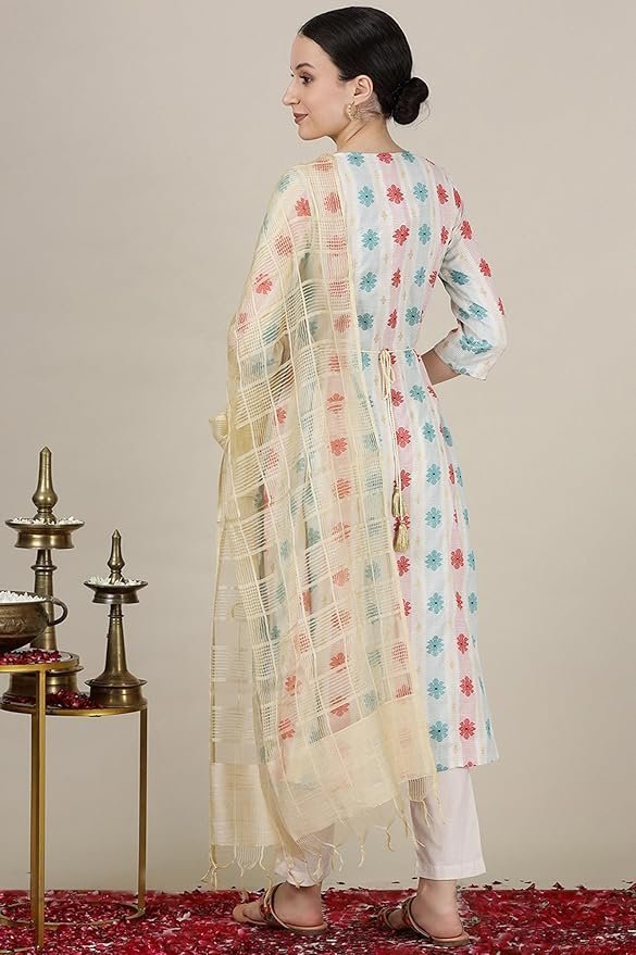 - Fabric: This 95% rayon, 5% zari kurta for women is made with premium rayon quality; trouser is made with rayon, dupatta is made with viscose rayon. The kurta set has long-time wearability and is friendly to skin.